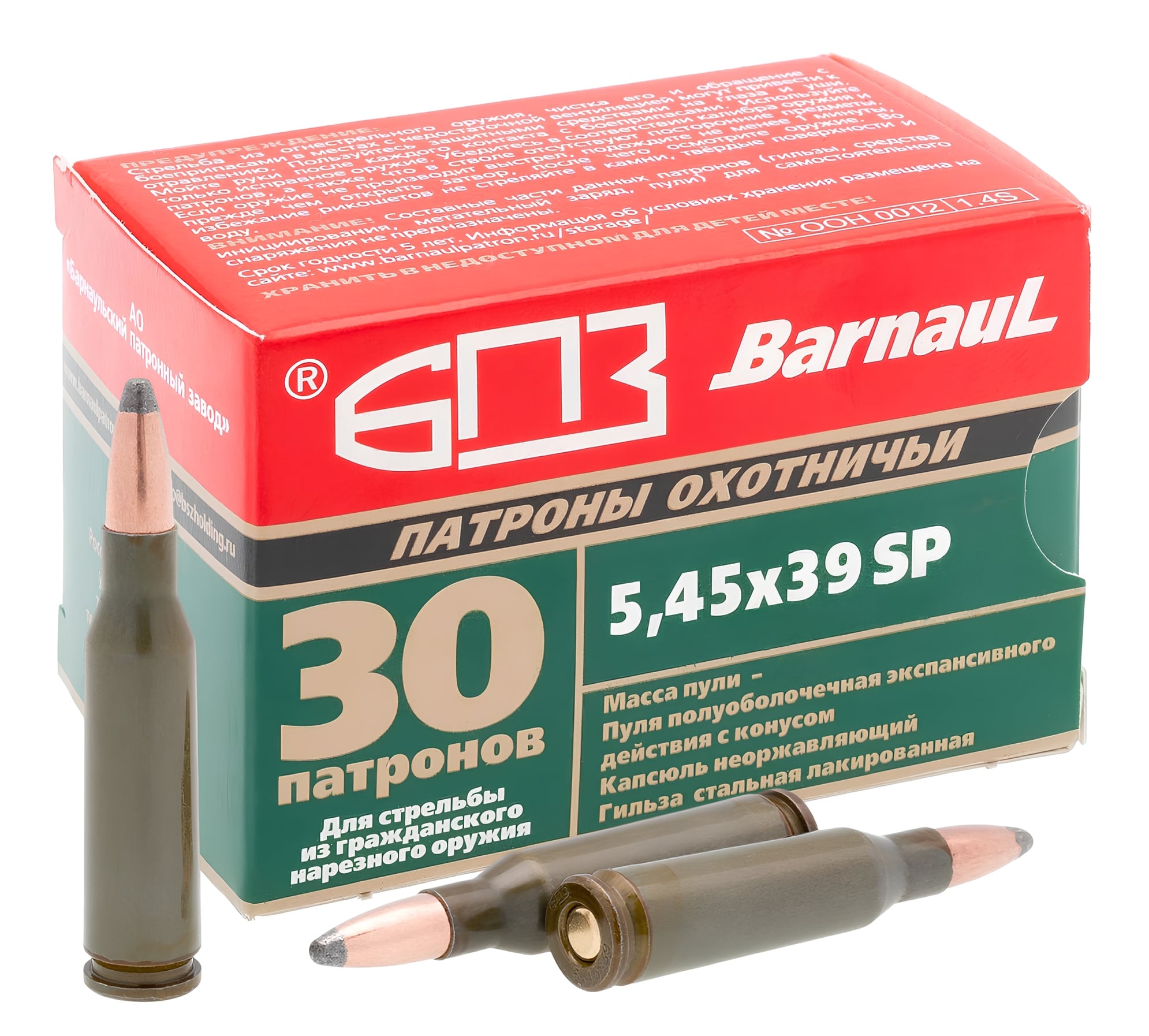 5,45×39 мм — созданный российскими оружейниками как конкурент американскому.223 Remington, этот патрон отличается высокой начальной скоростью, хорошим останавливающим действием и высокой настильностью траектории. Обладает малой отдачей, что улучшает кучность стрельбы. Однако, несмотря на свои достоинства, склонен к рикошетированию, поэтому использовать его следует с осторожностью. Вес пули составляет 3,61 грамма.