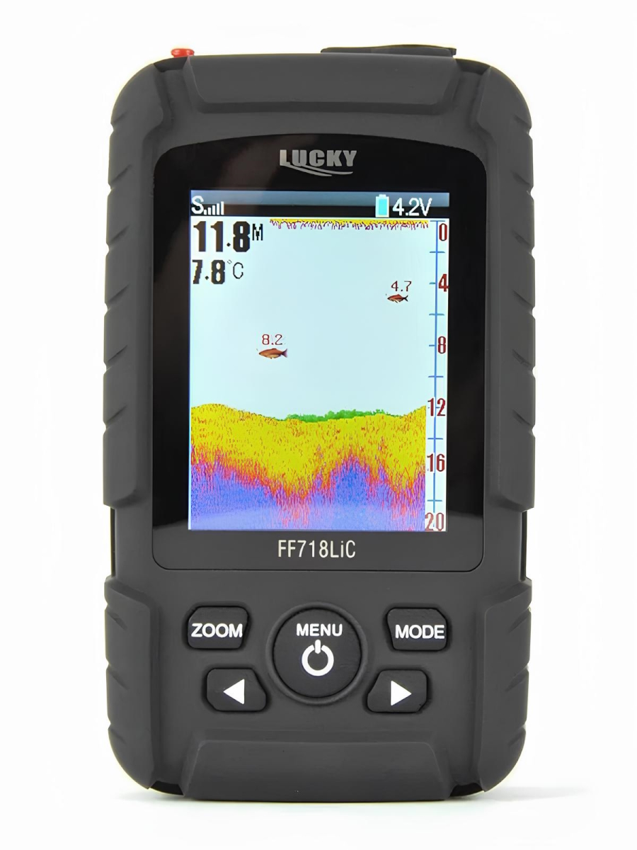 Первый цветной эхолот LUCKY. 2 датчика в комплекте- 1-ый 45 градусов при 200 кГц проводной. 2-ой беспроводной 90 градусов. Встроенная память позволяет запомнить настройки сонара.