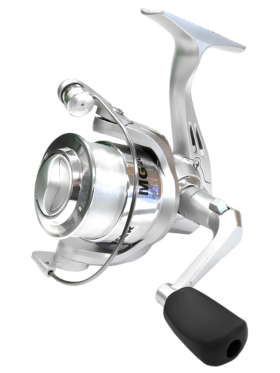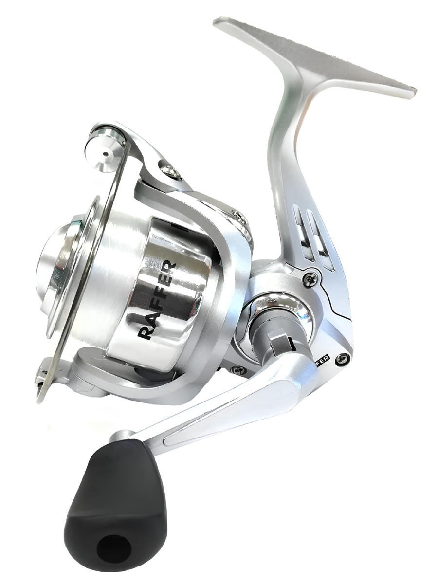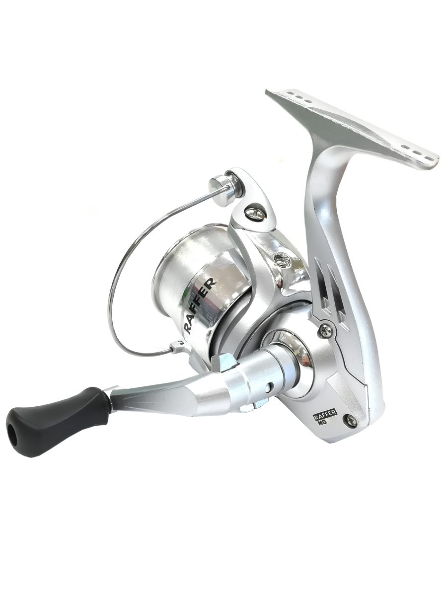 Катушка Raffer MG. Данная модель прежде всего предназначена для новичков спиннинговой ловли, комплектуется преднамотанной леской диаметром 0.28 мм и разрывной нагрузкой до 7 кг. Катушка идеально подойдет для оснащения спиннингов легкого и среднего класса.