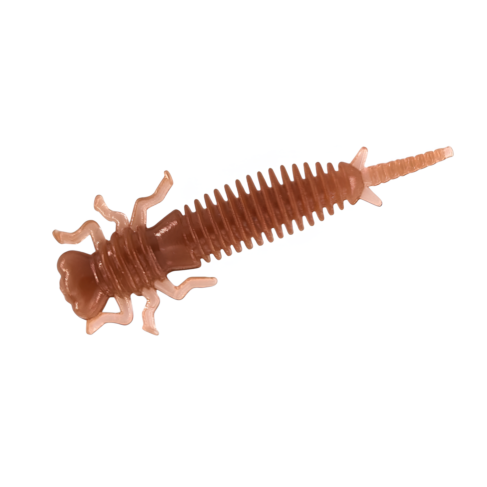 Именно такой приманкой является Ларва. Её реалистичная голова и грудная часть с тонкими лапками переходят в массивное плоское тело, покрытое кольцевыми рёбрами. У живой личинки стрекозы таких рёбер нет, но они обеспечивают точную имитацию ощущений хищника, схватившего нежную добычу. Когда рёбра сминаются в пасти, они контактируют со вкусовыми рецепторами рыбы по увеличенной в несколько раз поверхности, выделяя соль и натуральный аттрактант, которые входят в состав материала.