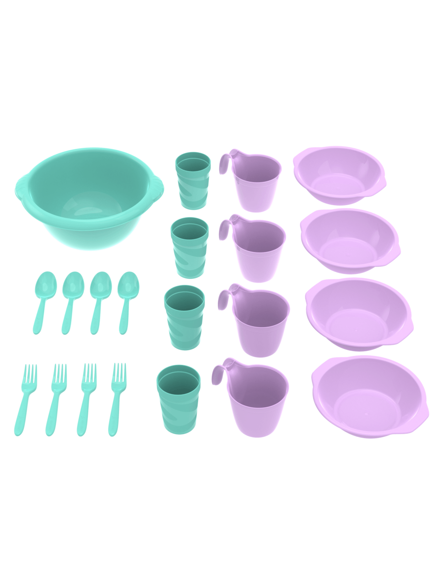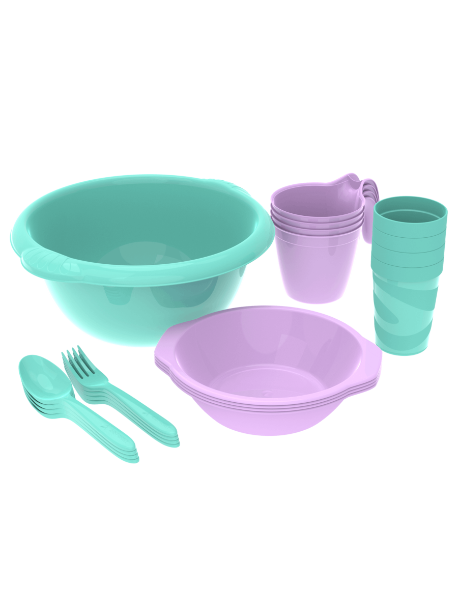 Набор посуды для пикника №1 рассчитан на четыре человека. Мы изготавливаем его из пищевого пластика, безопасного для здоровья и не содержащего вредных примесей, включая Бисфенол А. Весь набор легко помещается в одной миске, что делает его компактным и удобным для хранения на полке или в багажнике автомобиля.