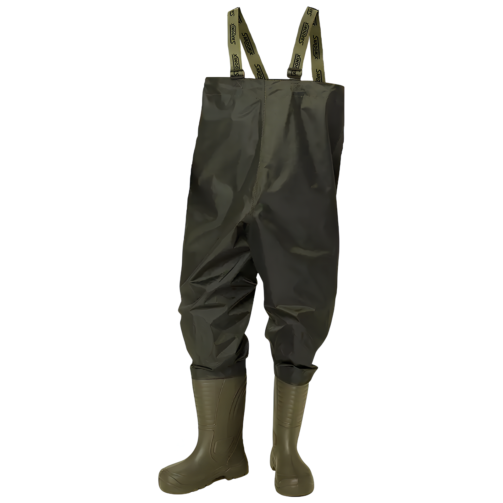 Верх рыбацкого полукомбинезона изготовлен из нейлона, обладающего высокой прочностью, износостойкостью и эалстичностью. Нейлон герметично соединен с сапогом, что позволяет носить его поверх верхней одежды. Низ галоши выполнен методом трехкомпонентного литья с применением третьего дополнительного промежуточного слоя подошвы из ЭВА, что придает обуви высокие амортизационные, теплозащитные, антистатические и противоскользящие свойства.