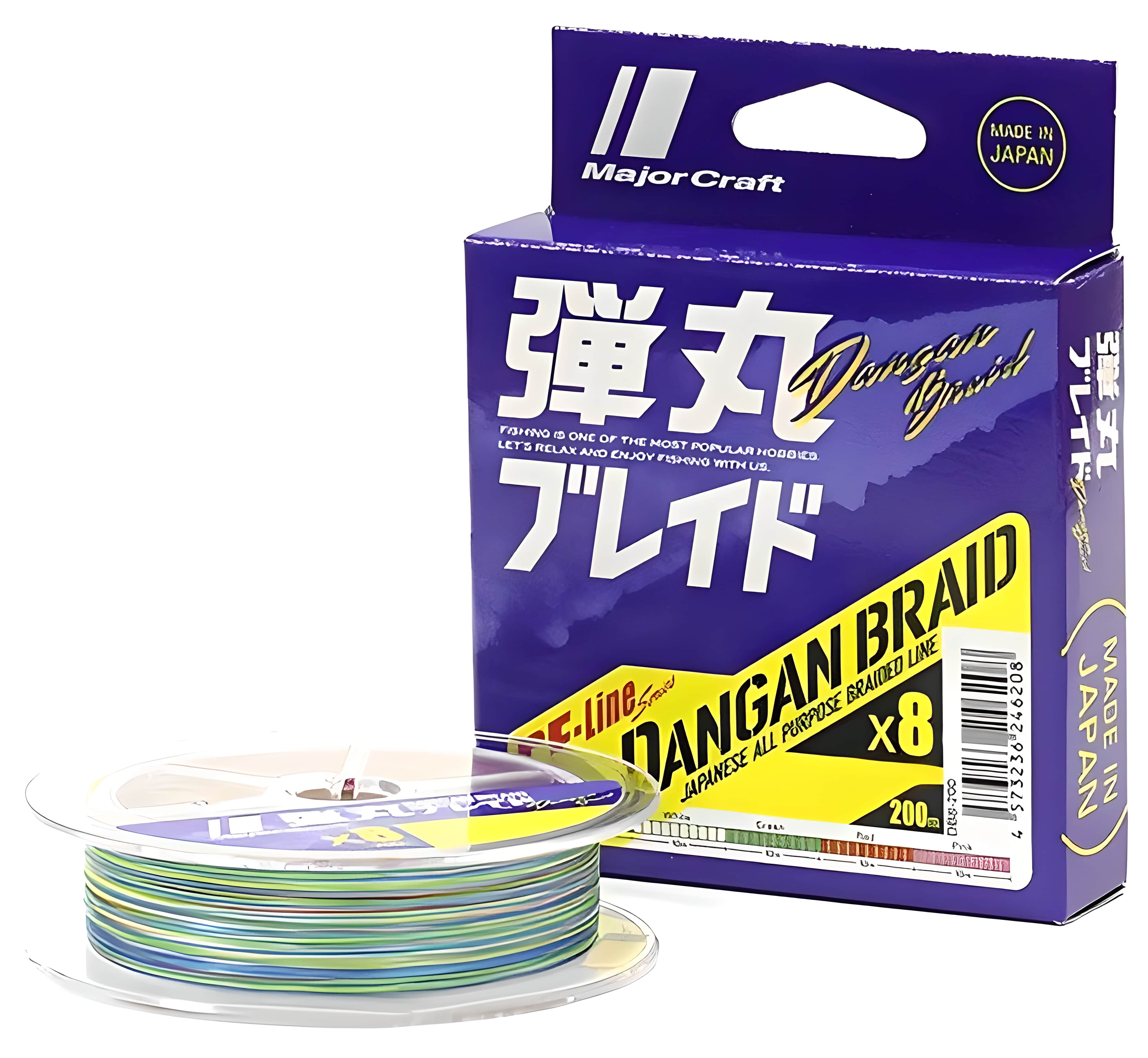Dangan Braid X8 - линейка восьмижильных плетеных шнуров от известного рыболовного бренда Major Craft. Шнуры изготовлены на японской фабрике из сверхпрочного полиэтиленового волокна Tobio. Оно имеет низкое растяжение и обладает хорошей чувствительностью. Шнуры имеют супер гладкое покрытие, благодаря чему уменьшается трение о кольца, увеличивается дальность заброса и улучшается укладка шнура в катушке. Восьмижильные шнуры являются отличным вариантом для любителей спиннинговой ловли на воблеры и блесна. Dangan Braid X8 обладает плотным плетением, высокой абразивоустойчивостью и большой разрывной нагрузкой. Данная модель шнура многоцветная, с маркировкой через каждые пол-метра и сменой цвета шнура через каждые 10 метров. Длина плетенки - 200 метров.