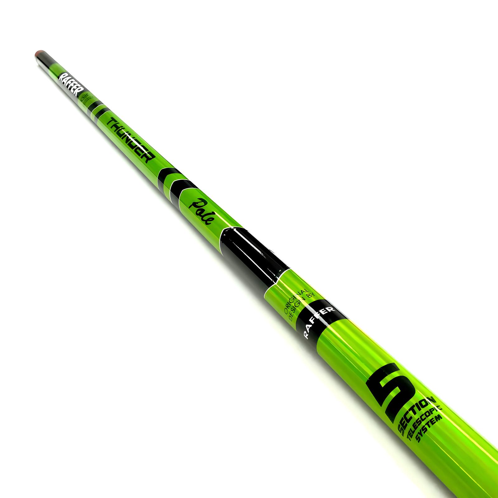 Маховое удилище Raffer Thunder. Материал, из которого изготовлено удилище, это композитный графит повышенной прочности, из него производится основная часть удилища, а именно секции. Кончик выполнен из чистого графита и придает всей конструкции легкость и высокую чувствительность. Сделано это в первую очередь с целью улучшить реализацию поклевок и придать удилищу дополнительную гибкость, которая ценится среди любителей поплавочной ловли. Удилище может оснащаться как классическими коннекторами, так и коннектором типа канат. Длина удилищ варьируется от четырех до шести метров, позволяет использовать снасть, как в прибрежных местах водоемов, так на дальних дистанциях.