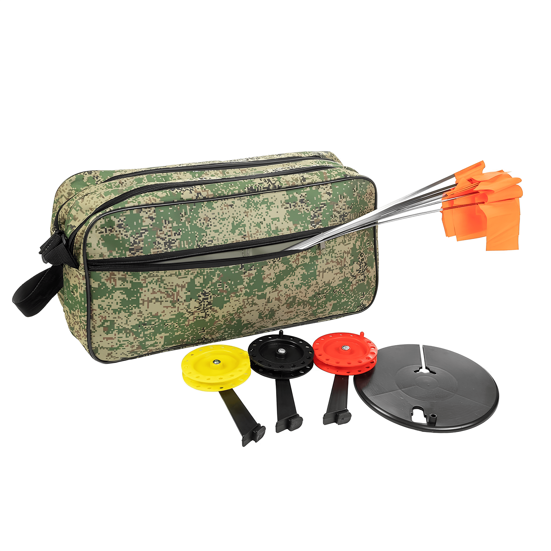 В нашей коллекции представлен набор жерлиц с угловой стойкой в сумке «Щукарь». Диаметр катушки в этом наборе составляет 85-90 мм. В сумке можно найти 10 комплектов, каждый из которых включает в себя подставку, стойку с катушкой и сигнальный флажок. -