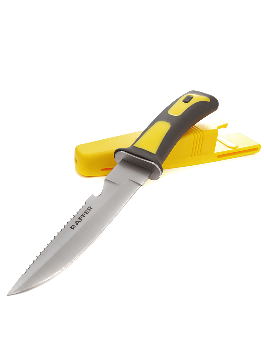 Нож для дайвинга Raffer KN-055 — это настоящее произведение искусства. Он обладает атравматической рукоятью с небольшими выступами у основания, что обеспечивает безопасность кисти руки во время использования. Ножны клипсового типа с резиновым ремнём позволяют надежно зафиксировать нож на поясе, ноге или предплечье.