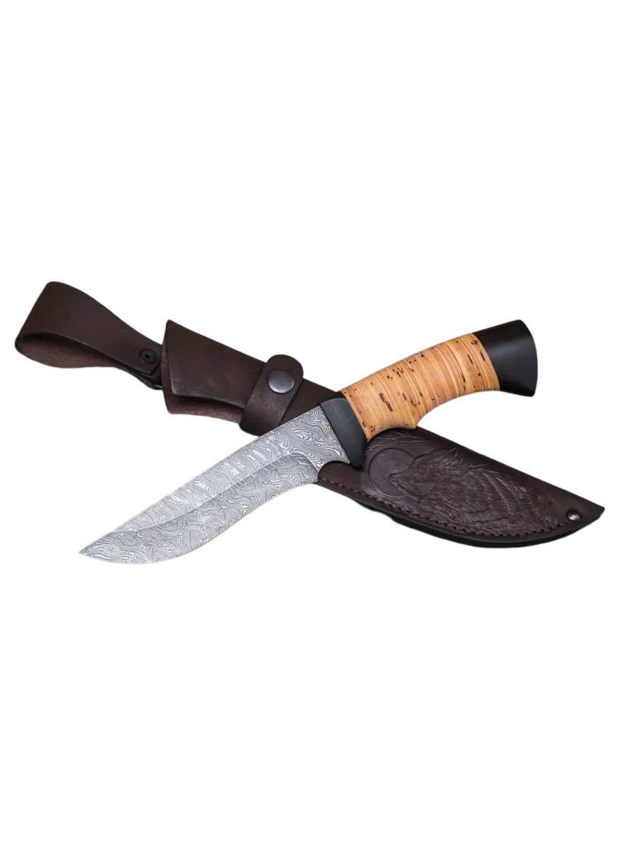 Нож Галеон сделанный вручную мастерами кузницы Сёмина, при ковке клинка использовалась Дамасская сталь, твердость которой составляет 59 - 62 HR, толщина - 2.5 мм. Для изготовления рукоятки используется береста, граб.