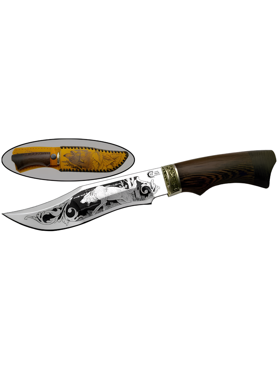 Нож Муромец сделанный вручную мастерами кузницы Сёмина из города Ворсма, Нижегородской области. При изготовлении клинка использовалась сталь 95х18, с твердостью которая составляет 57 - 60 HRC (Чем выше показатель, тем надежнее и долговечнее нож). При производстве рукоятки используется литье, венге.