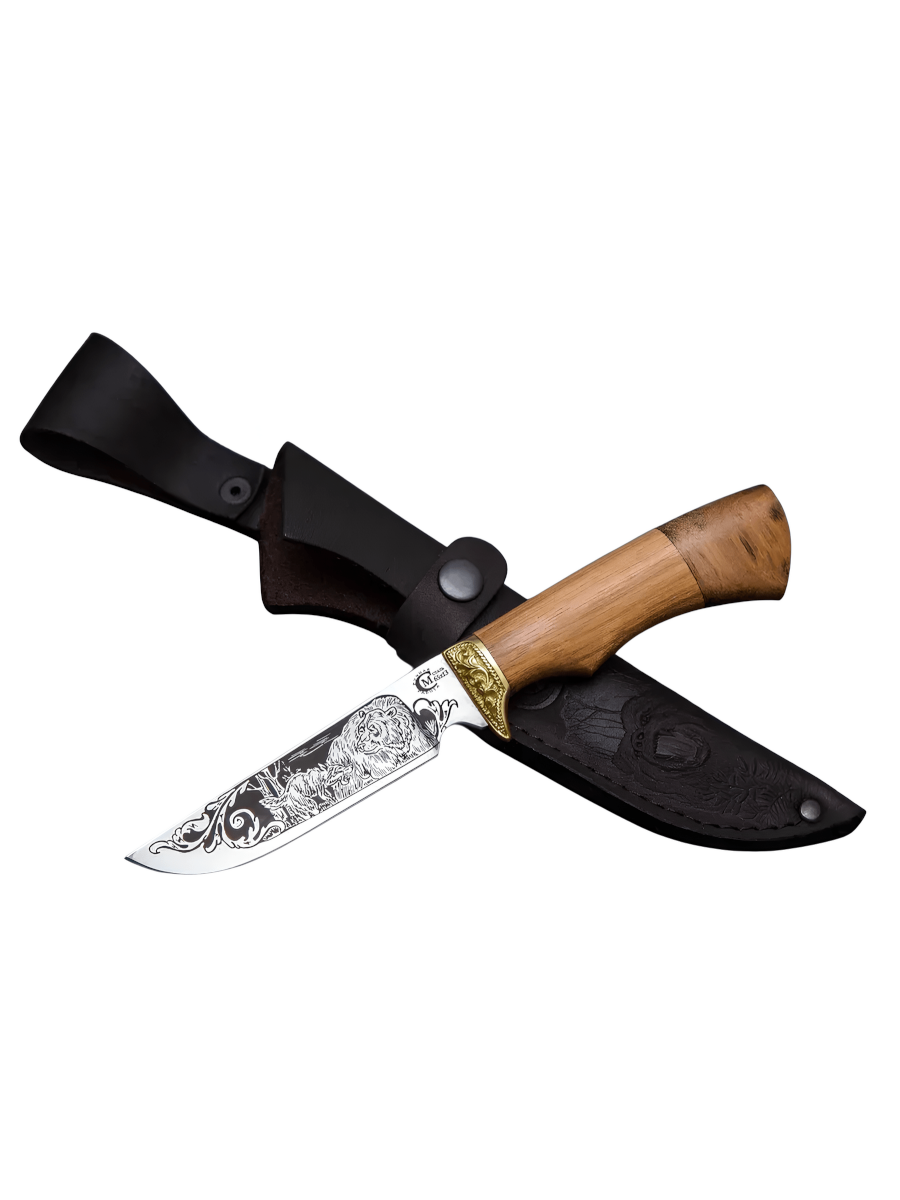 Кованый нож «Пластун» выполнен из стали 65х13 с гравировкой на клинке. Удобная рукоять из бересты и ореха обеспечивает надежный захват.