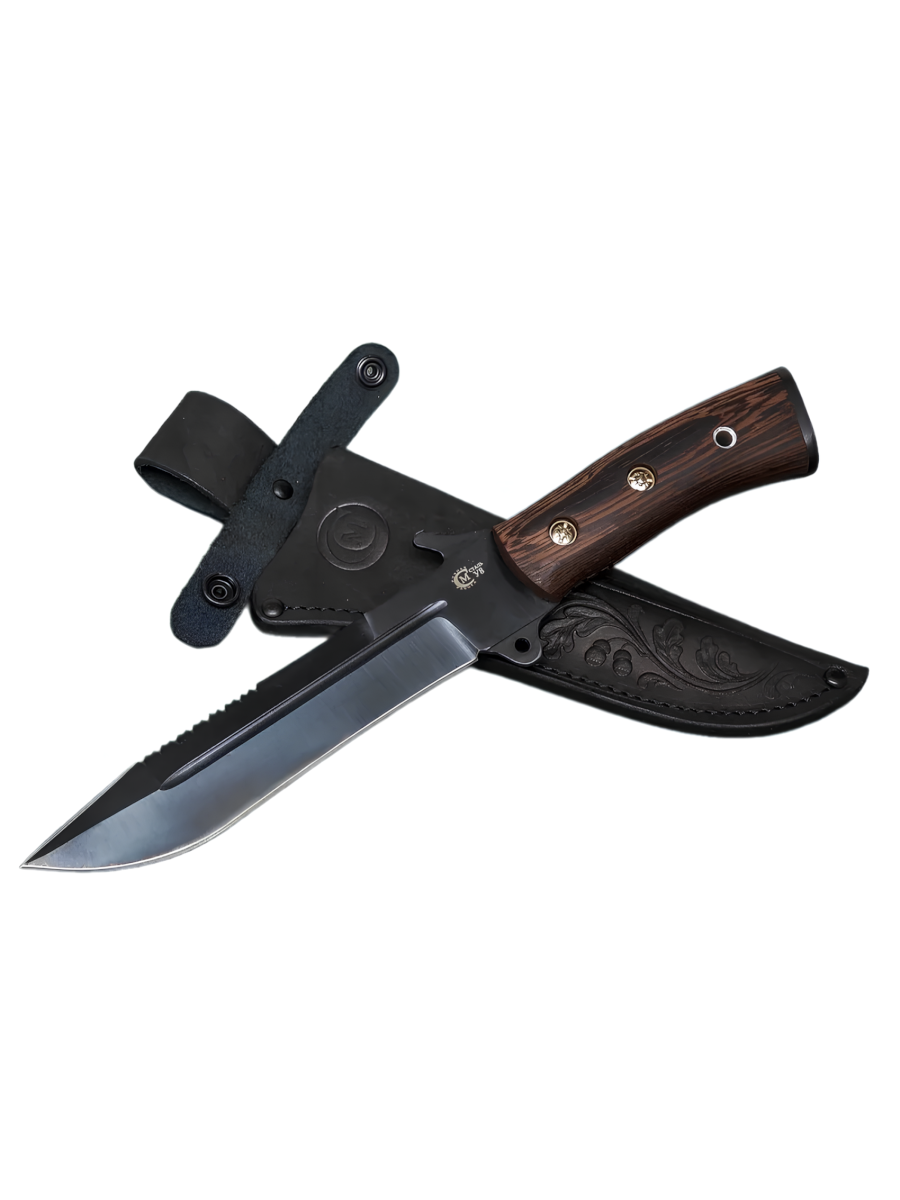 Тактический нож Смерч - это незаменимый помощник для выживания везде, где бы вы ни оказались: в горах, в лесах или пустыне. Ножик сделан вручную мастерами кузницы Сёмина из города Ворсма, Нижегородской области. При изготовлении клинка использовалась устойчивая к коррозии сталь У8, с твердостью которая составляет 54 - 56 HRC (Чем выше показатель, тем надежнее и долговечнее нож). Тип профиля клинка Clip Point с клиновидной заточкой долго не тупится и приспособлен для разнообразных работ и задач. Клинок на обухе имеет серрейторную заточку и дол на плоской стороне увеличивающий прочность и твердость. Для удобства нож имеет упор для большого пальца. Эргономичная рукоять из редкой и ценной породы тропического дерева Венге с цельным продолжением хвостовика (Full Tang) устойчива к повреждениям. Накладки рукоятки для максимальной надежности закреплены винтовым соединением. Нож укомплектован ножнами из натуральной кожи, с петлей для удобного ношения на поясе. Общая длина ножа составляет 315 мм при весе 343 грамма.