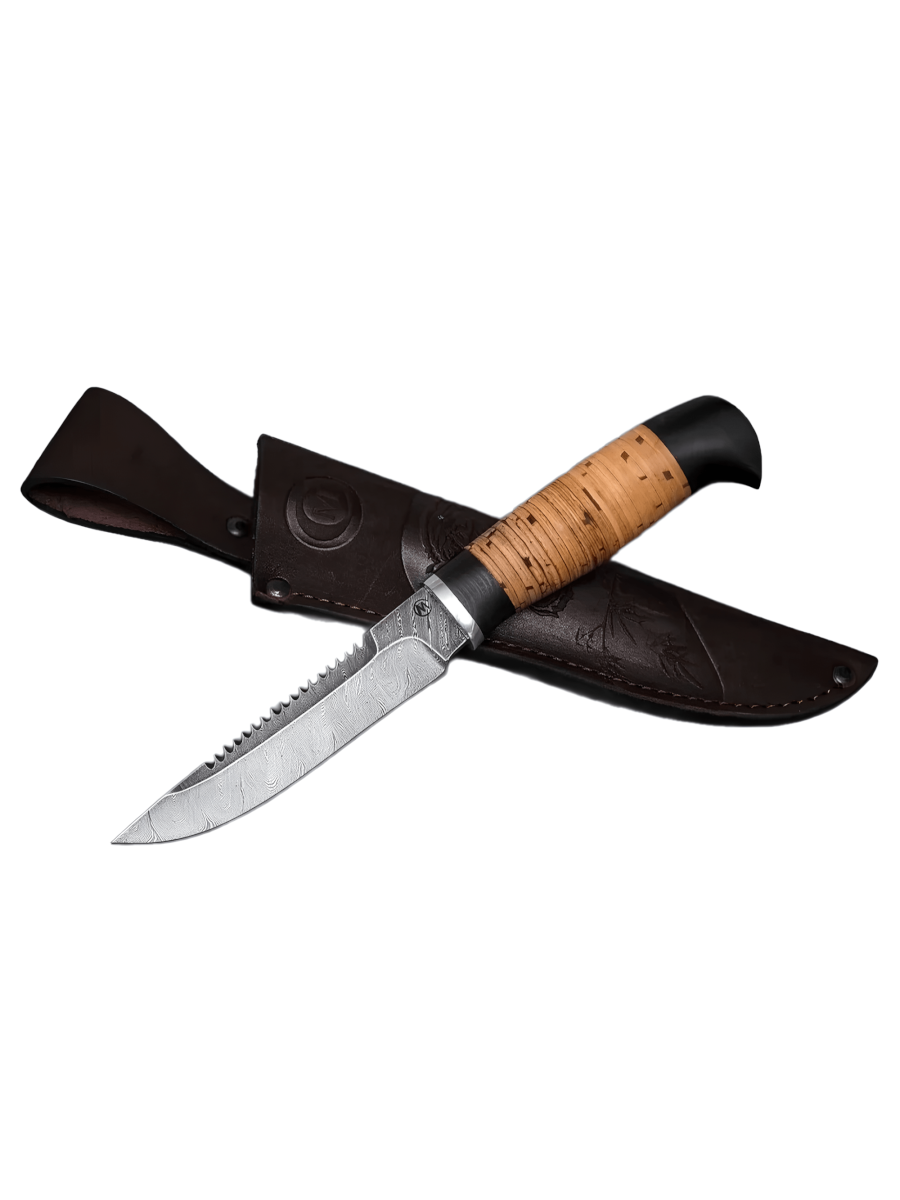 Клинок каждого ножа изготавливается из дамасской стали, обладающей высокой твёрдостью. Благодаря этому охотничий нож надёжно удерживает заточку и с лёгкостью справляется с самыми разными задачами: от работы в походном лагере до реза по дереву и кости.