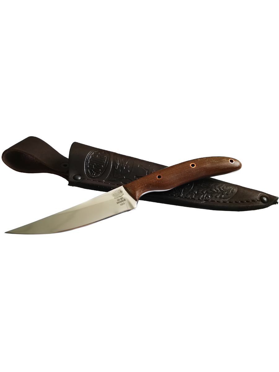 Охотничий нож в европейских традициях. Наиболее удобными для охотника являются ножи, позволяющие выполнять как режущие, так и колющие действия. Поскольку в Европе во все века существовало множество видов охоты, то со временем были отобраны разные виды ножей. Этот вариант больше подходит для мелкой и средней дичи. От французских мастеров осталось мало экземпляров именно охотничьих версий. Но требования к ним частично совпадают с английскими и немецкими. Поэтому при работе дизайнеры учитывали скорее европейские наработки, нежели особенности той или иной страны. Но после изготовления опытного образца, он был подарен именно французам, поскольку у златоустовских мастеров сложились добрые отношения с одним из городов-побратимов. Знатоки высоко оценили данный вариант, теперь нож запущен в производство.