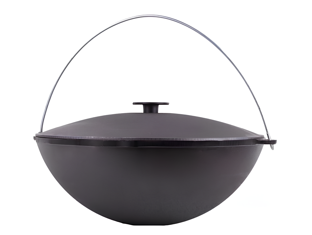 Казан походный татарский производства Гардарика. Чугунная крышка, дужка из алюминия прочная. Казан тонкостенный 4 мм, что облегчает его вес, но также уменьшает способность стенок сохранять тепло и увеличивает возможность подгорания пищи. Облегченный вес и удобная дужка для крепления казана позволяют его взять в поход без специальных печей, а как вы знаете, в походе каждый килограмм на вес золота. Но опытные повара вам скажут, что в таком подвешенном состоянии готовить можно, но не очень удобно. Четыре ручки по краям для удобного хвата.
